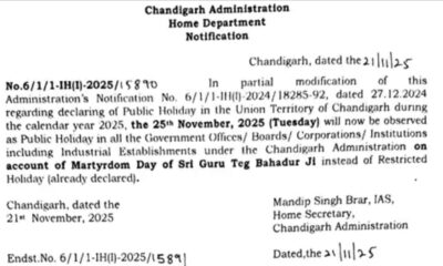 ਚੰਡੀਗੜ੍ਹ ਪ੍ਰਸ਼ਾਸਨ ਨੇ ਸ੍ਰੀ ਗੁਰੂ ਤੇਗ ਬਹਾਦਰ ਜੀ ਦੇ 350ਵੇਂ ਸ਼ਹੀਦੀ ਪੁਰਬ ਨੂੰ ਮਨਾਉਣ ਲਈ 25 ਨਵੰਬਰ ਨੂੰ ਛੁੱਟੀ ਦਾ ਐਲਾਨ ਕੀਤਾ ਹੈ। ਇਸ ਸਮੇਂ ਦੌਰਾਨ...